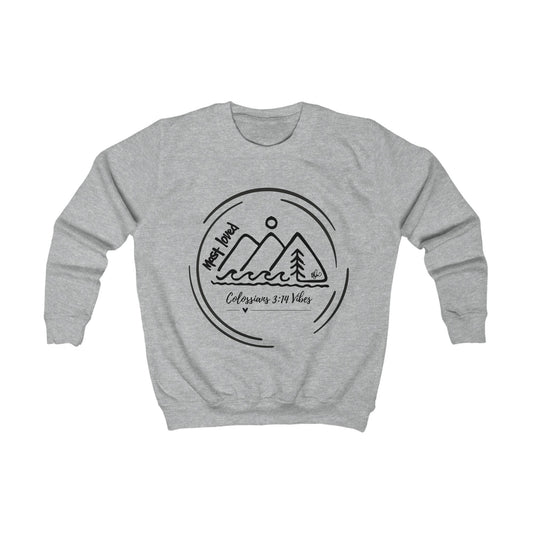 Kids Sweatshirt – Happy Island Mountain & Waves Design (Colossians 3:14 Kids Crewneck)